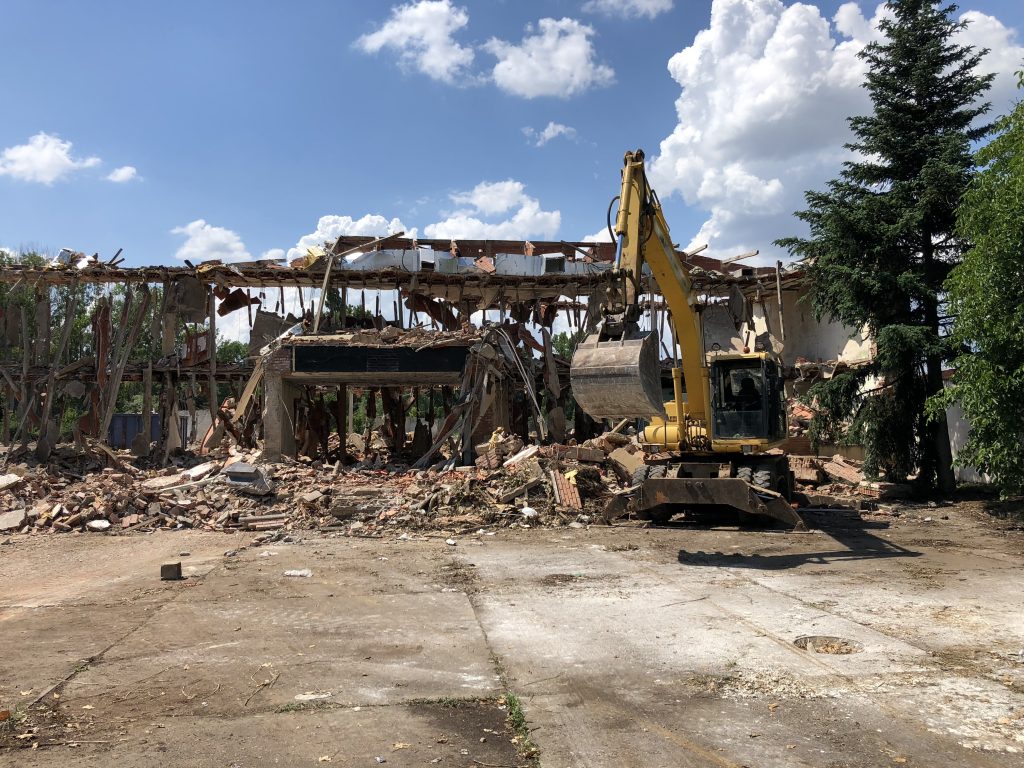 Demolición de edificio en Tapicerías Soto, separando hierro, con carga y transporte del escombro a planta de reciclaje. Obra realizada en colaboración con Tejados CRP.